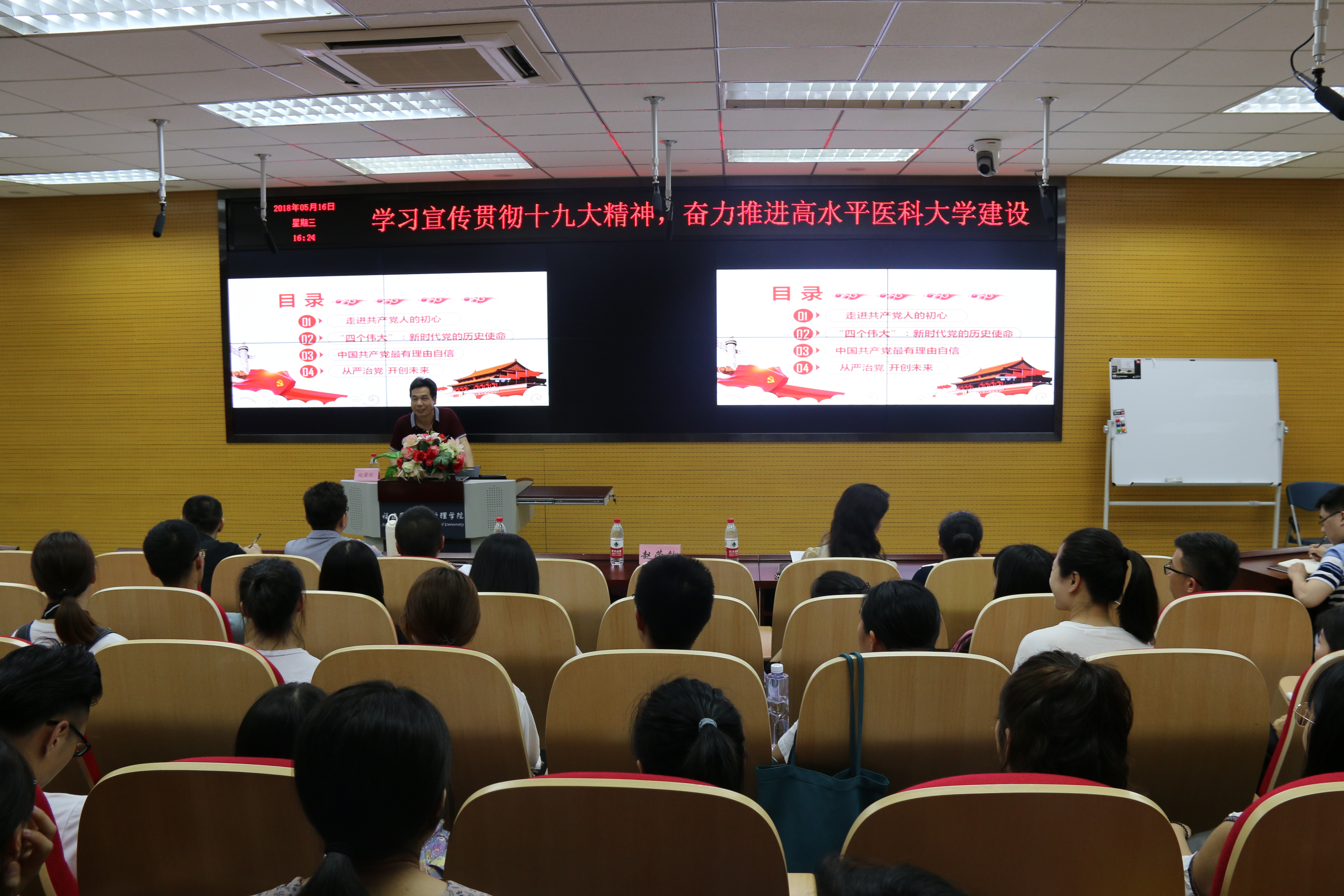 为深入学习贯彻党的十九大精神,大力推动十九大精神往深里走、往实里走、往心里走,奋力推进高水平医科大学建设。2018年5月16日下午,党的十九大精神第二轮宣讲主讲人赵荣钦同志为全院师生党员及入党积极分子做题为“共产党人的初心与使命”的专题讲座。赵荣钦同志从走进共产党人的初心、“四个伟大”:新时代党的历史使命、中国共产党最有理由自信、从严治党开创未来四个方面讲解做了深入阐述与分析。通过宣讲,使与会师生进一步树立不忘初心、牢记使命的责任感,为高水平医科大学建设而不断奋斗的信心。