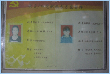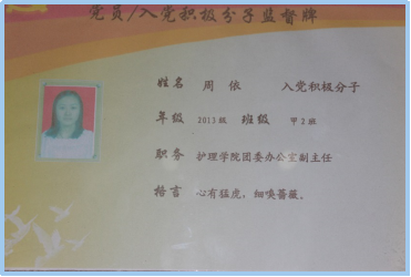 设立党员/入党积极分子监督牌为大学生党员/入党积极分子提供了一个展示自我,经验交流、示范带动的平台。宿舍是大学校园最小的组织单位,也是学生们生活集中、活动时间长、问题复杂敏感的学生管理盲区,通过宿舍区挂设党员/入党积极分子监督牌做法,实现了“一名党员、一面旗帜”的工作效果,是创建和谐宿舍、和谐班级、和谐系部、和谐校园必不可少且行之有效的重要举措。