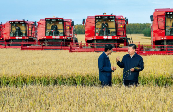 2018年9月25日至28日,习近平总书记在东北三省考察并主持召开深入推进东北振兴座谈会。这是25日下午,习近平总书记在黑龙江农垦建三江管理局七星农场万亩大地号了解粮食生产和收获情况。新华社记者 谢环驰/摄