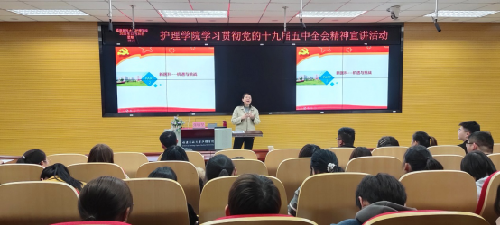 2020年12月30日晚上18:30,护理学院在田家炳楼会议室举办党的十九届五中全会宣讲活动,校学生工作部部长张敏坚做了题为《在学思践悟中坚定理想信念在奋发有为中践行初心使命》的辅导报告,学院学生工作办公室老师和100名学生代表参加了宣讲会。