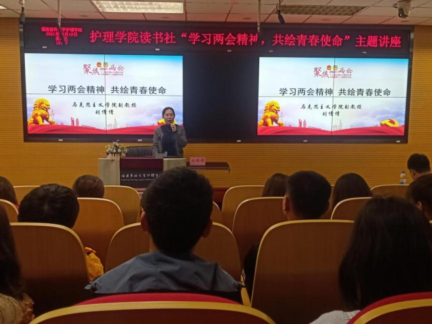 为深入学习贯彻全国两会精神,护理学院习近平新时代中国特色社会主义思想读书社于3月19日在田家炳楼示教室举办“学习两会精神,共绘青春使命”主题讲座,邀请校马克思主义学院中国近现代史纲要教研室主任、学院青年读书社指导老师刘倩倩副教授作为主讲嘉宾。学院2018级辅导员吴杰宸老师,学院学生党员、预备党员、入党积极分子及读书社成员共82人参与本次讲座。