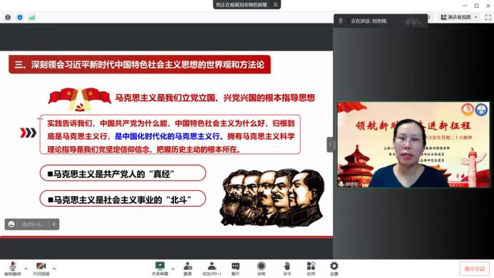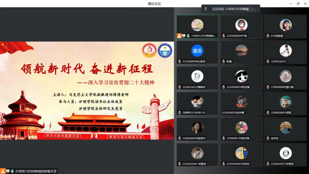为引导护理学子深入学习贯彻党的二十大精神,深刻理解把握党的二十大精神实质和核心要义,做到学深悟透、融会贯通,护理学院习近平新时代中国特色社会主义思想读书社联合护理学院研究生会思想政治教育部,于11月9日在腾讯会议成功举办“领航新时代 奋进新征程——深入学习宣传贯彻党的二十大精神”主题讲座,特邀beat365马克思主义学院近代史纲要教研室主任刘倩倩老师担任主讲人。马克思主义学院近代史纲要教研室副主任常陌塘老师、护理学院2022级辅导员陈善文老师、全体读书社成员和全体研究生党员参加,人数逾150人。