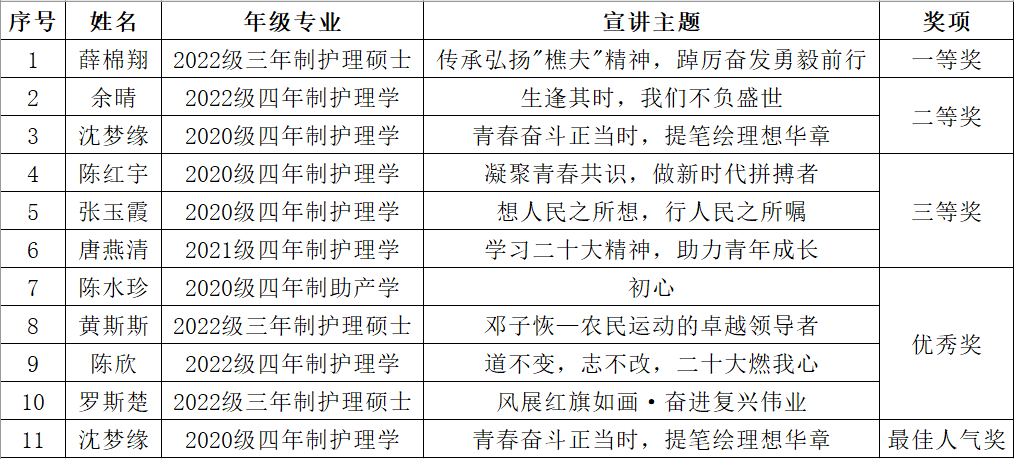 经过激烈角逐,比赛最终产生10名优秀宣讲员、1名最佳人气奖,具体奖项及名单如下: