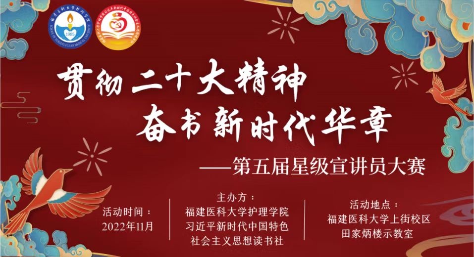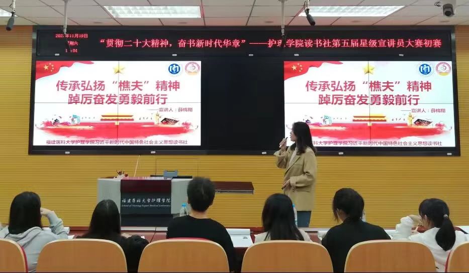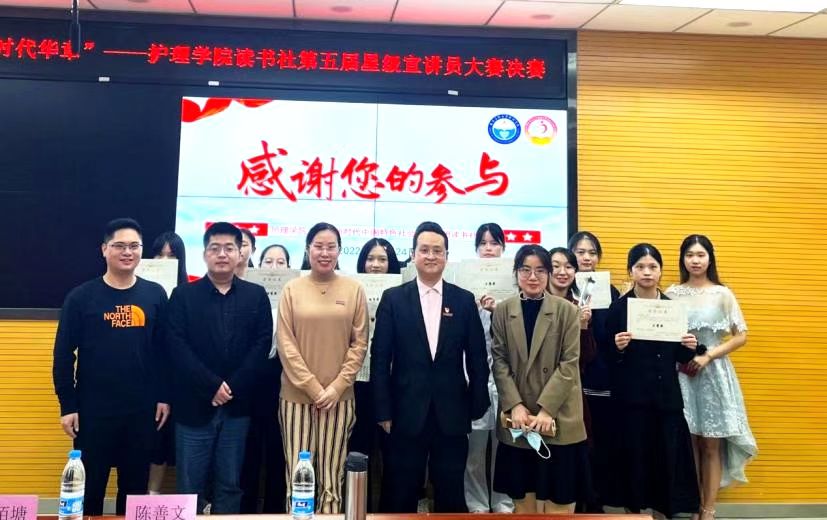 为深入学习贯彻党的二十大精神,引导护理学子自信自强、守正创新、踔厉奋发、勇毅前行,打造一支有思想、有担当、有作为的青年宣讲队伍,护理学院读书社携手护理学院研究生会思想政治教育部成功举办“贯彻党的二十大精神,奋书新时代华章”第五届星级宣讲员大赛。比赛共分两轮,11月19日的初赛中,10位选手脱颖而出;11月24日读书社于田家炳楼示教室成功举办决赛。
