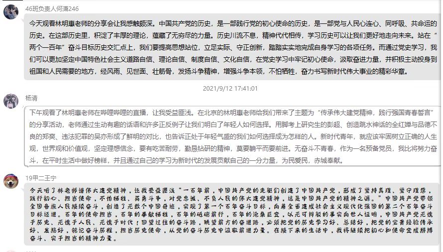 一进入直播间,便被林明惠老师的言语所打动,我们随隔着屏幕,我却依然感受到了老师的拳拳爱国之心,和对青年殷切的期望。通过缅怀革命先烈,以及针砭时事,为我们新时代大学生上了生动的一课。