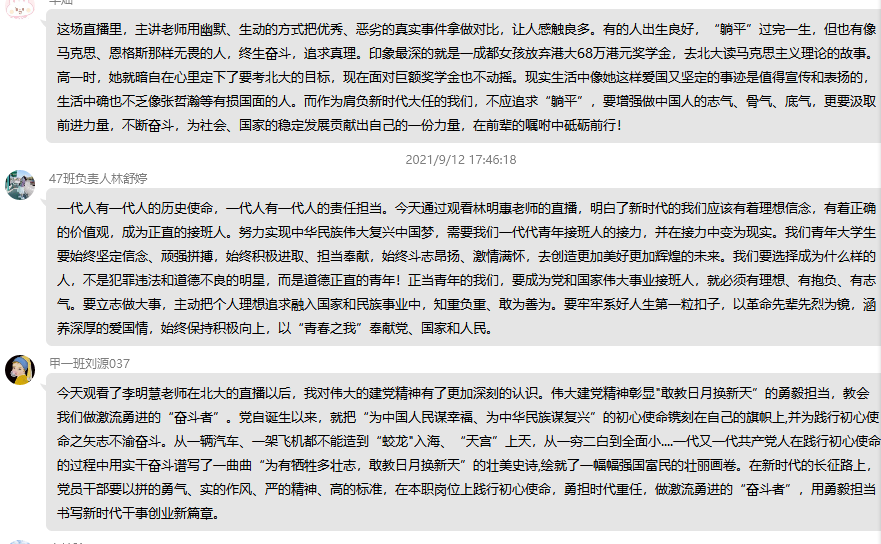 这场直播里,主讲老师用幽默、生动的方式把优秀、恶劣的真实事件拿做对比,让人感触良多。有的人出生良好,“躺平”过完一生,但也有像马克思、恩格斯那样无畏的人,终生奋斗,追求真理。印象最深的就是一成都女孩放弃港大68万港元奖学金,去北大读马克思主义理论的故事。高一时,她就暗自在心里定下了要考北大的目标,现在面对巨额奖学金也不动摇。现实生活中像她这样爱国又坚定的事迹是值得宣传和表扬的,生活中确也不乏像张哲瀚等有损国面的人。而作为肩负新时代大任的我们,不应追求“躺平”,要增强做中国人的志气、骨气、底气,更要汲取前进力量,不断奋斗,为社会、国家的稳定发展贡献出自己的一份力量,在前辈的嘱咐中砥砺前行!