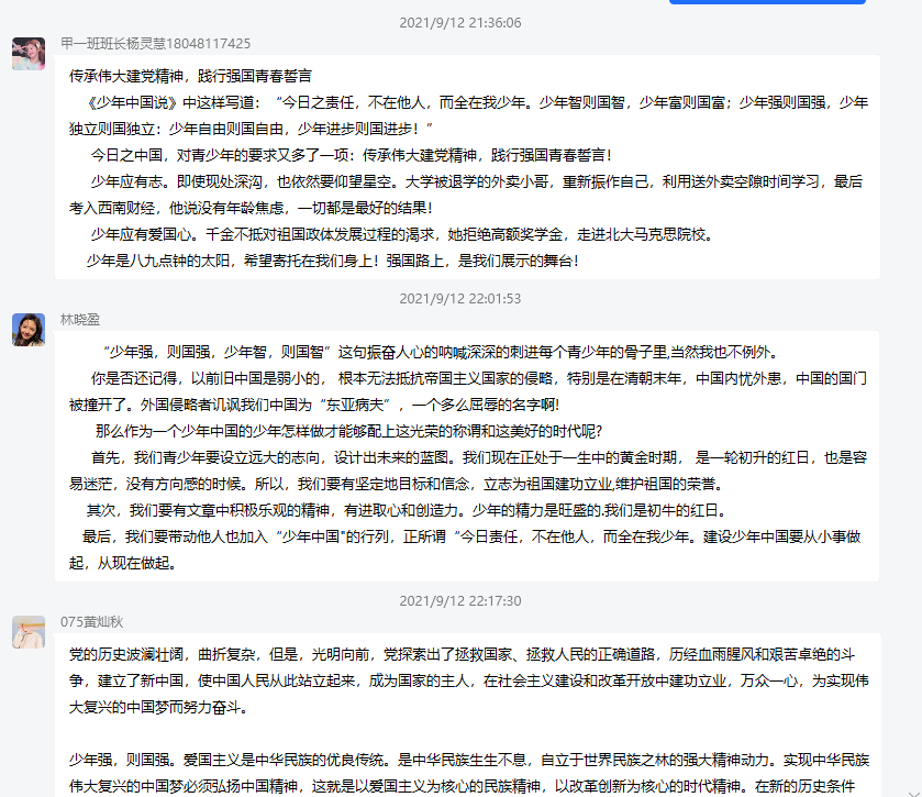 “心有所信,方能行远。”总书记勉励青年,面向未来,走好新时代的长征路,我们需要坚定理想信念、矢志拼搏奋斗。在聆听林明慧老师的讲话中,不禁对自己发出疑问:应如何把握自己的人生?对自己的现状是否满意?是否了解自己呢?不断的提出疑问并且不断探寻是寻找真理的方法。在“七一”讲话中提到,青年一代应有做中国人的志气、骨气和底气。社会上总有“家庭出身决定了你的命运”“寒门出不了贵子”的相关舆论泛起阵阵漩涡。其实不然,家庭出身是你的地基的一部分,你可以自己建立坚固的地基,在上面筑起高楼大厦。建筑风格各异,如何抉择?成都女孩王艺瑾弃港全额奖学金去北大学习马克思主义,对国家、历史的深入了解为她坚定了理想。李大钊不惧危险积极传播马克思主义新思想,正值青春年华不幸逝世。“这就像穿衣服扣扣子一样,如果第一粒扣子扣错了,剩余的扣子都会扣错。人生的扣子从一开始就要扣好。”贯彻伟大建党精神,学会“坚守”“践行”,守住“使命”“理想”,做有志有为的青年,虽做不到建国初期为国家抛头颅洒热血的豪情,但做得到认识自我,超越自我,反思自我,与国家同呼吸共命运。作为新时代的青年,处在和平幸福的时代,更应深刻认识前辈们闯下浩浩伟业的不易,唱响青春誓言!