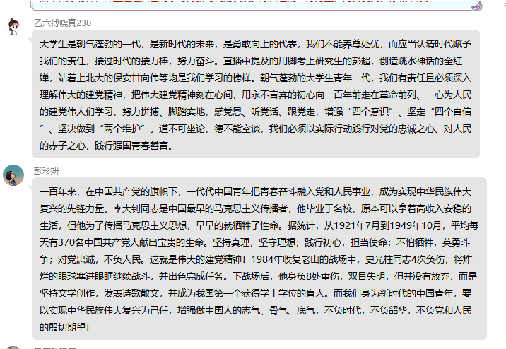明惠老师在直播中以李大钊同志为例带我们了解“坚持真理,坚守理想;践行初心,担当使命;不怕牺牲,英勇斗争;对党忠诚,不负人民”的伟大建党精神内涵,又以近期违法失德艺人的事告诫我们青年一代要有理想信念。河南洛宁,14岁女孩因疫情上网课,家里没网络,每天到村支部蹭网学习;北大保安甘相伟依靠奋斗考上北大中文系,获得与北大学子并肩的机会;彭超高考考入四川大学法学院,2021年4月被同济大学法学院录取,他曾言:“用脚答题,我一样会写出我的灿烂人生”。通过他们的事迹,我深刻体会到要坚定理想信念,始终保持艰苦奋斗的前进姿态。 通过听取本次直播,我学习了伟大建党精神的内涵以及习近平总书记“七一”重要讲话精神。身为入党积极分子,我将坚定理想信念,传承伟大建党精神,践行强国青春誓言,增强做中国人的志气、骨气、底气,认真学习专业知识,练就过硬本领,积极向党组织靠拢,向党员学习。