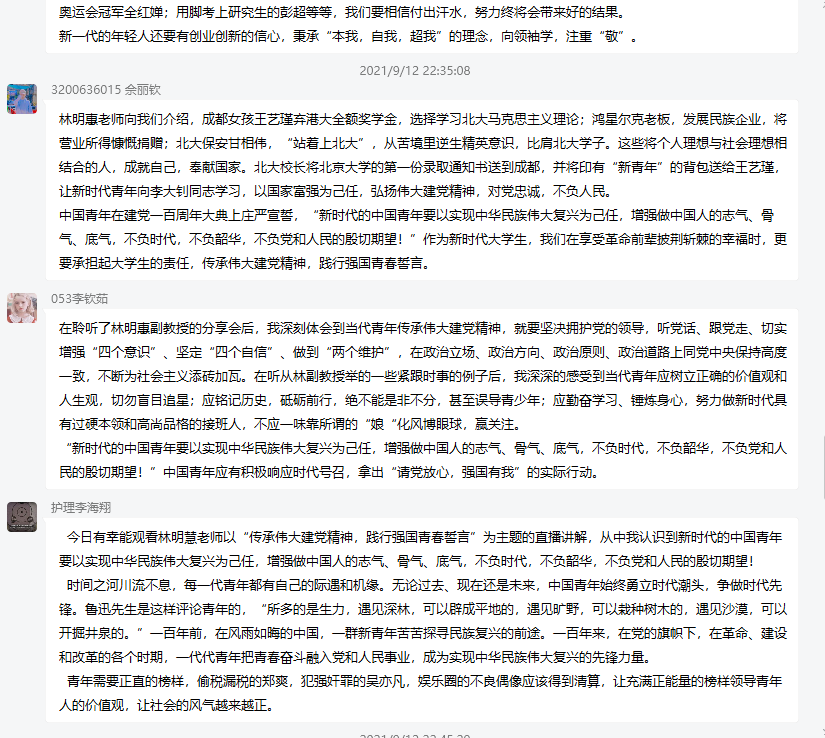 今日有幸能参加林老师“传承伟大建党精神,践行强国青春誓言”为主题的直播讲解,在林明惠老师的带领下,通过了解马克思、李大钊等前辈为马克思主义的创造与传播付出的巨大艰辛,史光柱、彭超、王艺瑾等新时代青年为马克思主义、伟大建党精神付诸实践,让我学习到了“坚持真理,坚守理想、践行初心,担当使命、不怕牺牲,英勇斗争、对党忠诚,不负人民”的伟大建党精神,了解到了,当今时代下,青年一代的我们应该有所为、有担当、有信仰,不断增强中国人的志气、底气、骨气,不负时代,不负韶华;同时,我也了解到了,当今,许多所谓的明星、网红所做的不符合时代精神、不符合规章制度、不符合身份的事情,他们不仅受到了网友的抨击,也为自己所犯下的错误买了单。这也提醒了我们,我们应该遵守规则、守住底线、积极向上、传播正能量、做自己应该做的事情。