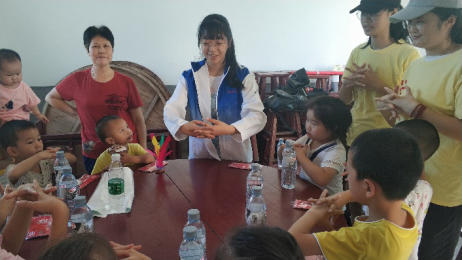 实践队申明村留守儿童上了一堂生动有趣的户外教育课。队员巧妙设计教学形式,寓教于乐,将紧扣专业知识的“七步洗手法”教给留守儿童,与孩子们进行交流,并通过踢毽子、踢球等户外活动,拉