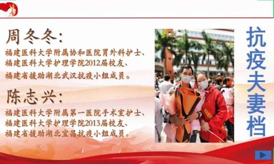 在抗击疫情的第一线,活跃着许多我院优秀校友的身影,他们时刻牢记着福医护理的精神,用实际行动践行当初许下的誓言。我院2012届校友周冬冬和2013届校友陈志兴是驰援湖北队伍中的一对“夫妻联盟”。在直播中,这对“抗疫夫妻档”和学弟学妹们分享了她们在武汉和宜昌的战疫故事。志兴学长还特别提到临床男护士在此次抗疫斗争中发挥的重要作用,也和同学们交流了男护士在临床的作用和发展。连线最后,学长学姐们祝福学院的发展越来越好,护理学子前程似锦。
