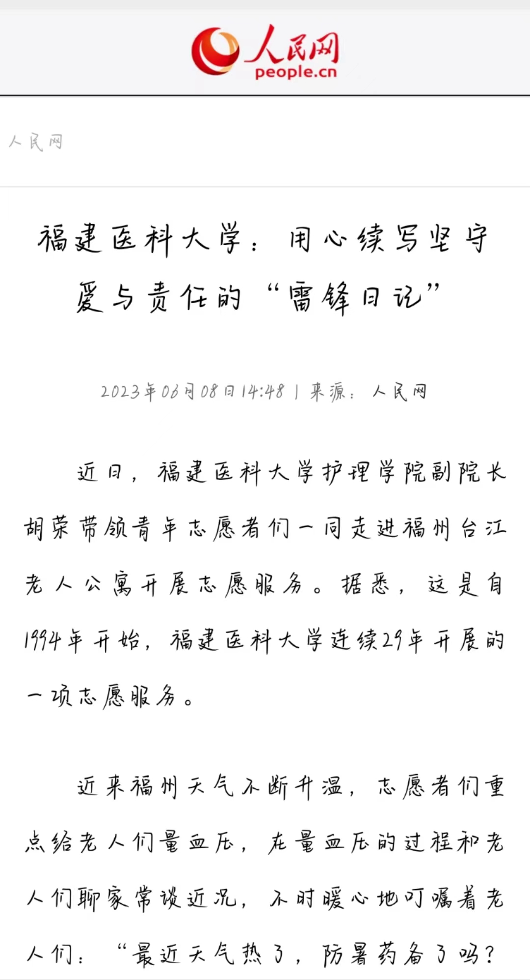 人民网报道护理学院志愿服务活动